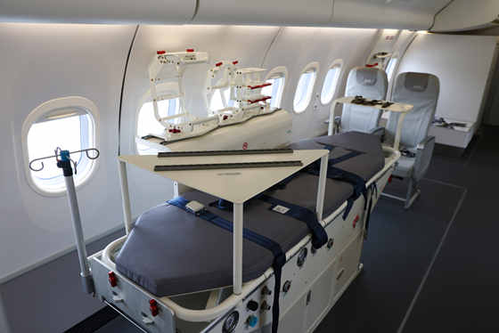 C909醫療機最大設計商載10噸,標準航程可達3700公里,具備高高原機場(chǎng)起降能力。艙內布局可根據不同救援需求靈活改裝,能夠滿(mǎn)足醫療救援隊伍出行、邊遠地區醫療救助、傷病員轉運等多場(chǎng)景應用。