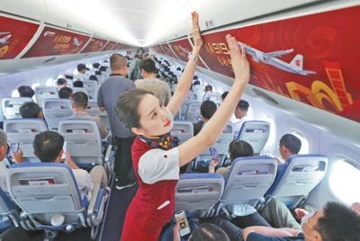 國航C919飛機上,乘務(wù)員進(jìn)行客艙檢查。邱超奕 陶冉攝影報道