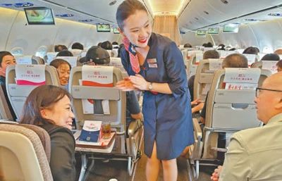 東航C919飛機上,乘務(wù)員與乘客交流。陸瓊艷攝(人民視覺(jué))