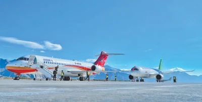 C919飛機(右)飛抵西藏拉薩,與ARJ21飛機相聚青藏高原,開(kāi)展環(huán)控、航電、動(dòng)力裝置等高高原運行關(guān)鍵系統的研發(fā)試飛。王脊梁攝(人民視覺(jué))