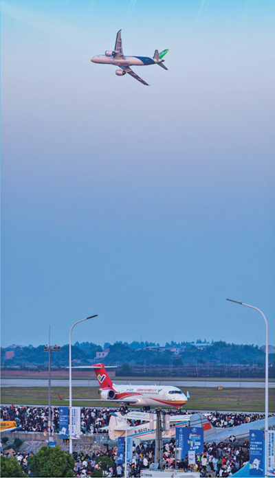 11月2日,在2024中國航空產(chǎn)業(yè)大會(huì )暨南昌飛行大會(huì )開(kāi)幕式上,中國商飛C919和ARJ21飛機首次雙機編隊飛行表演,贏(yíng)得現場(chǎng)觀(guān)眾熱情歡呼。目前,C919已在我國三大航空公司國航、東航、南航投入商業(yè)運營(yíng),正式邁入多用戶(hù)多機隊運營(yíng)階段;與此同時(shí),今年C919首次飛抵拉薩貢嘎國際機場(chǎng)開(kāi)展高高原運行關(guān)鍵系統研發(fā)試飛,首次加注可持續航空燃料執行商業(yè)航班任務(wù),首次飛出國門(mén)亮相新加坡航展……國產(chǎn)大飛機取得一個(gè)又一個(gè)新進(jìn)展。